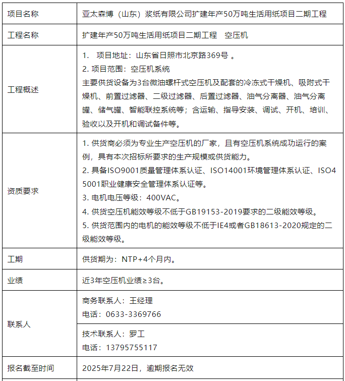 亞太森博(山東)漿紙有限公司擴建年產(chǎn)50萬噸生活用紙項目二期工程空壓機采購詢價報名邀請