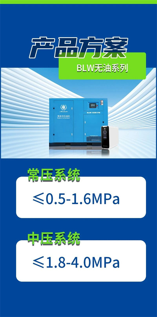 精密儀器氣源供應:激光檢測儀、顆粒計數器等設備需無油壓縮空氣(ISO 8573-1 Class 0級)。壓縮空氣需干燥潔凈氣源,避免油蒸氣干擾傳感器精度。氣動工具動力源:驅動氣動扳手、噴槍等維修工具,無油設計可延長工具壽命并防止污染精密部件。近年來,博萊特積極與高校、特檢院及第三方檢測機構展開深度合作,提供專業(yè)化、定制化的空壓機解決方案。通過技術創(chuàng)新與場景適配,滿足這些專業(yè)用戶的高要求。未來,博萊特將持續(xù)深化產學研合作,以智能化、綠色化的空壓解決方案賦能檢測行業(yè)高質量發(fā)展。